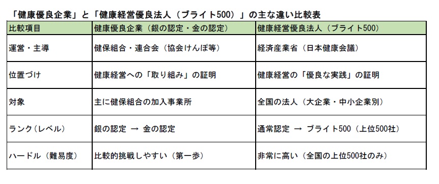 どちらも企業の健康づくりへの取り組みを評価する制度ですが、目的・位置づけ・認定主体・レベル感が異なります。