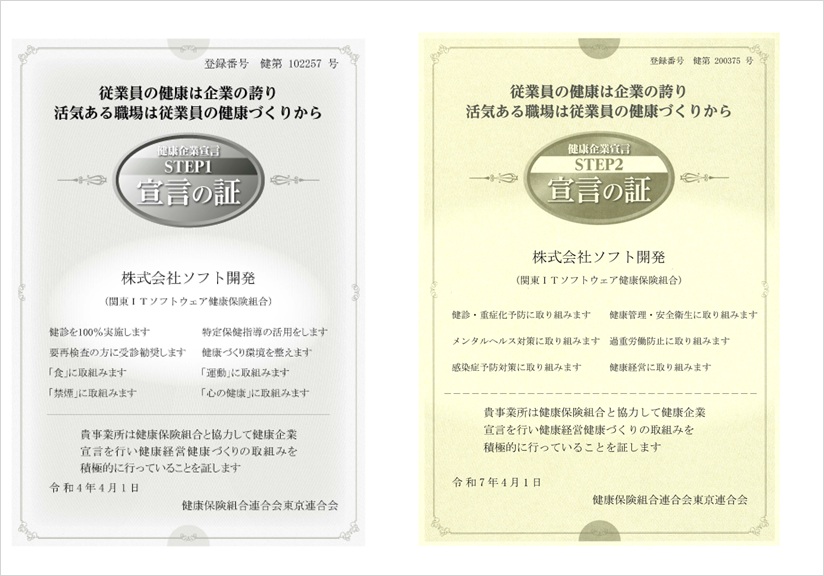 健康企業宣言は全国健康保険協会の登録商標で、健康優良企業 STEP1「銀の認定」 STEP2「金の認定」を目指して、企業全体で健康づくりに取り組むことを宣言することです。